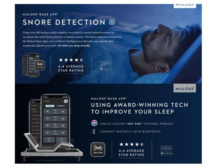 Control the base with Bluetooth controls and a snoring feature. Many features the app has, such as, manual controls to control head, foot, pillow tilt, and even the lumbar support feature. Even controls for dual massage, head and foot, duration, and intensity. The next addition to the app is the premier feature of anti-snore detection to detect snoring and raise the head of the base while asleep.