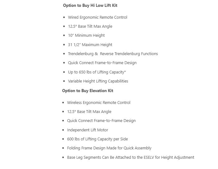 - Has all the features elevation kit has, but extra with features hi low, Trendelenburg, and Reverse Trendelenburg.